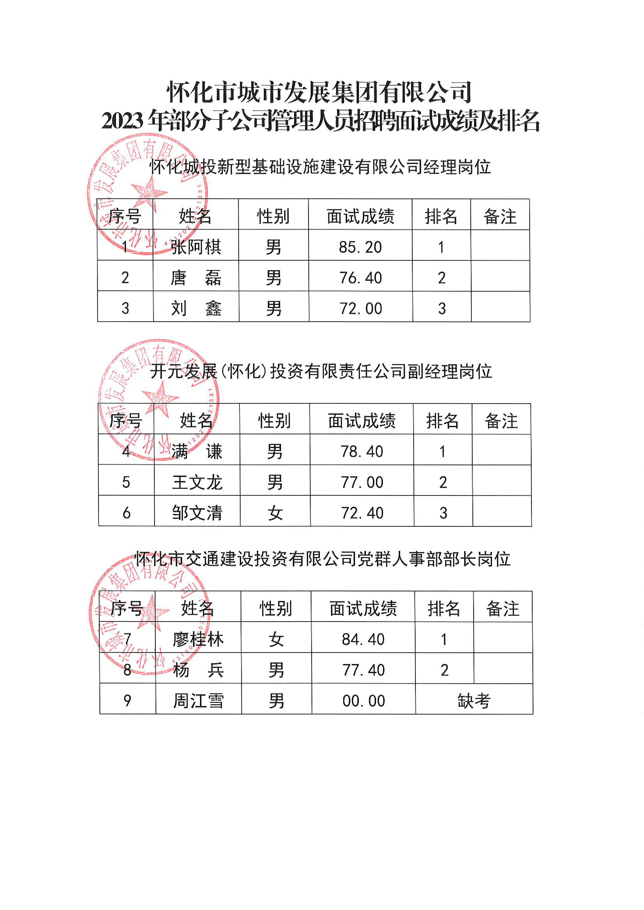 懷化市城市發(fā)展集團有限公司2023年部分子公司管理人員招聘面試成績及排名